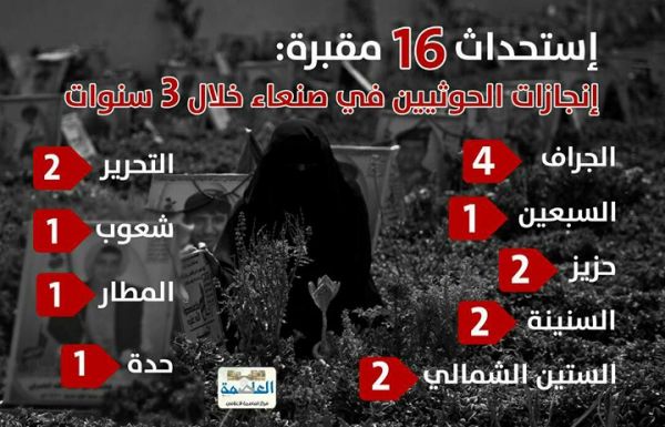 وبحسب إحصائية مركز العاصمة الإعلامي، فإن المقابر التي استحدثها الحوثيون في العاصمة صنعاء خلال ثلاثة أعوام، بلغت 16 مقبرة متوزعة على 10 مديريات، في حين شكا سكان في مديريات "السبعين والجراف وبيت بوس" من امتلاء المقابر الموجودة ما أدى إلى ارتفاع أسعار القبور نتيجة ازدياد عدد الوفيات وجثث مقاتلي الحوثي القادمة من جبهات القتال الذين سقطوا خلال المعارك مع القوات الحكومية، وبفعل ضربات طيران التحالف العربي الداعم للشرعية في مختلف الجبهات.
