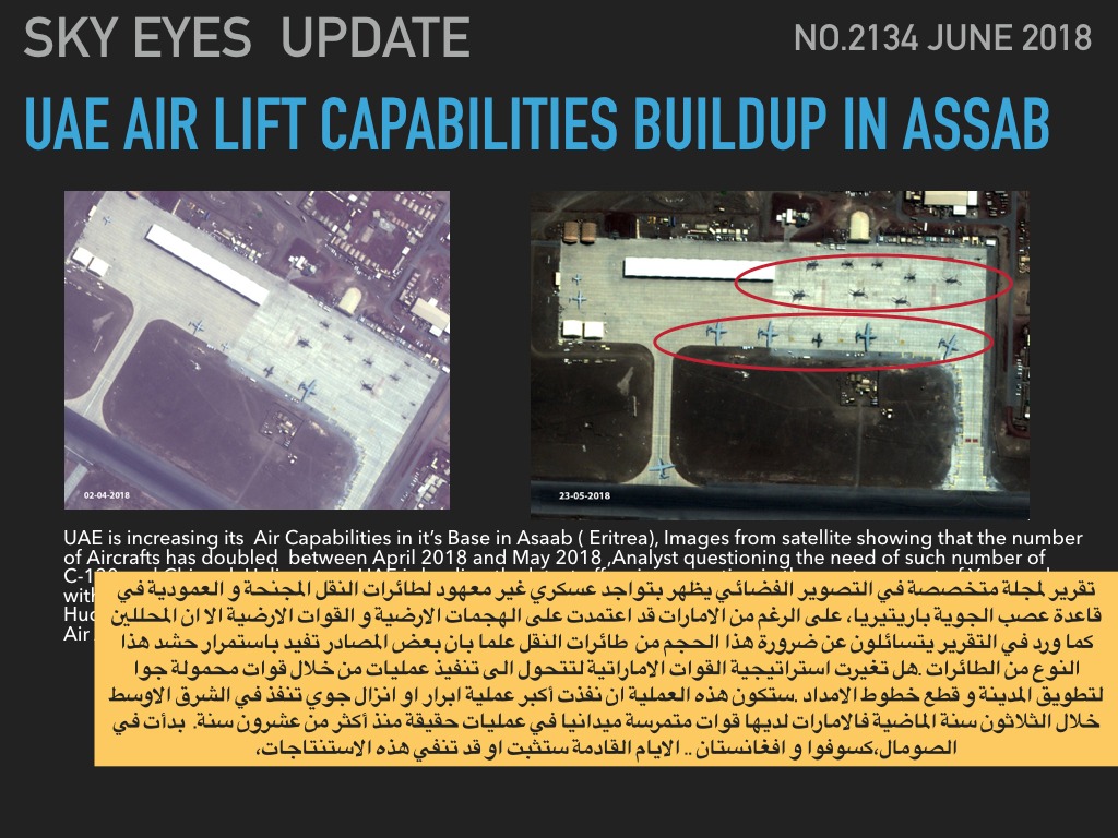 واضافت المجلة وفق لتحليل الصور، أنه على الرغم من الامارات قد اعتمدت على الهجمات الارضية والقوات الارضية خلال الفترة الماضية، إلا ان المحللين كما ورد في تقرير المجلة الامريكية يتسائلون عن ضرورة هذا الحجم من طائرات النقل في عصب.