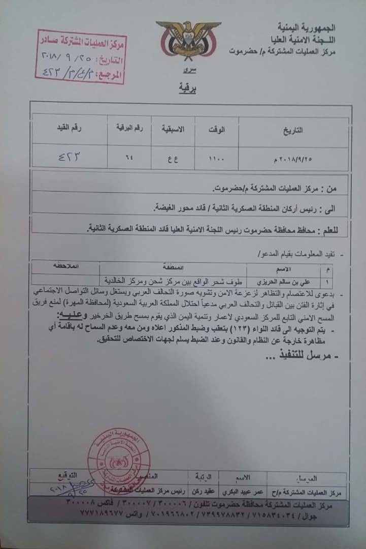 وبحسب الأمر المباشر الصادر من مركز العمليات المشتركة في حضرموت إلى رئيس أركان المنطقة العسكرية/قائد محور الغيظة تدعوه لتعقب واعتقال الشيخ الحريزي وعدم السماح له بإقامة مظاهرات.