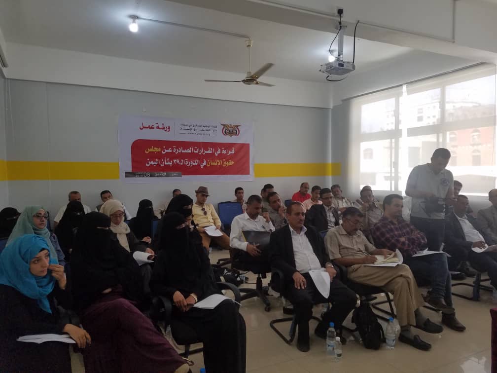 نظمت اللجنة الوطنية للتحقيق في ادعاءات انتهاكات حقوق الإنسان، اليوم الاثنين، بمحافظة تعز، ورشة عمل نقاشية لمنظمات المجتمع المدني والنشطاء في مجال حقوق الإنسان حول القرارات الصادرة في الدورة ال39 عن مجلس حقوق الإنسان بشأن اليمن.