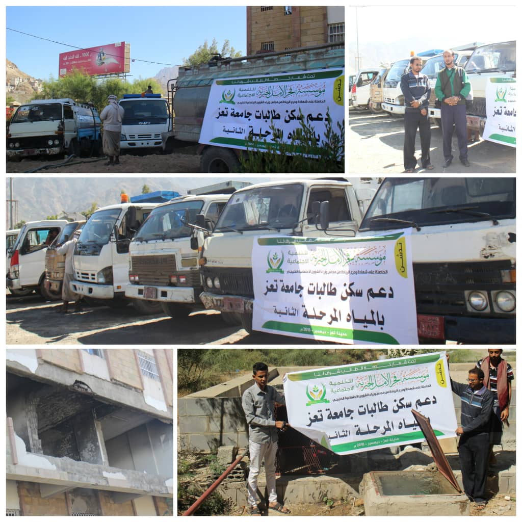 المؤسسة أعلنت في حينها انها ستعمل على دعم السكن بمقدار 200 الف لتر من الماء وقد وصل ماتم تنفيذه حتى اليوم 85 الف لتر ومازال المشروع مستمر لدعم أخواتنا الكريمات من طالبات جامعة تعز اللاتي يرسمن صورة مشرقه على الجد والمثابرة والصبر سعيا إلى التميز والرقي رغم كل الظروف العصيبة .