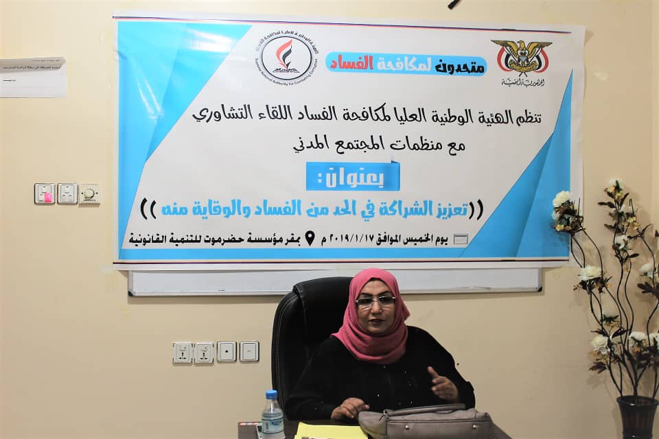 نظمت الهيئة الوطنية العليا لمكافحة الفساد اليوم بالمكلا لقاء تشاوري مع منظمات المجتمع المدني بعنوان تعزيز الشراكة في الحد من الفساد والوقاية منه. وفي اللقاء قالت رئيس الهيئة الوطنية العليا لمكافحة الفساد القاضية أفراح بادويلان ان اللقاء يأتي في إطار التحضير والاعداد لفتح أول فرع للهيئة بمحافظة حضرموت من خلال عقد لقاءات مع الشركاء من الجهات والأجهزة الرقابية وكذا شركاء الهيئة من منظمات المجتمع المدني والاعلام وأجهزة السلطة المحلية والقطاع الخاص. وأضافت الهدف من هذه اللقاءات هو تعزيز الشراكة وخلق جبهة جماهيرية عريضة ومتماسكة للحد من الفساد والوقاية منه. مشيرة الى ان أهمية التوعية بمخاطر الفساد ونشر مفاهيم الشفافية والنزاهة وتفعيل الرقابة المجتمعية والمحاسبة والحوكمة وتسييد القانون في كل مناحي الأداء الإداري والوظيفي بما من شانه حماية المال العام والوظيفة العامة. واشادت القاضية بادويلان بجهود ومواقف السلطة المحلية ممثلة بالمحافظ البحسني على دعمه المتواصل وتذليل كافة الصعوبات لكي يقوم فرع الهيئة بالمحافظة بمهامه على أكمل وجه. موضحا بان الأيام سوف تسهد توقيع مذكرة تفاهم بين الهيئة وجامعة حضرموت لاقامة الحلف الاكاديمي مع الجامعة تعقبها ورشة عمل عامة وكبرى تشارك فيها كل الأطراف من منظمات المجتمع المدني والاكاديميين والحقوقيين والاعلامين حيث ان الجميع مدعو اكثر من أي وقت مضى الى الاصطفاف لرصد الفساد وتعطيل ادواته ونشر التوعية بمخاطره وضرورة الوقاية منه. وقد أثري اللقاء بالآراء والمقترحات من قبل المشاركين بهدف تفعيل دور الرقابة المجتمعية والتوعية والتعريف بأهمية مخاطر الفساد حتى ينعم الجميع بوطن خال من الفساد.