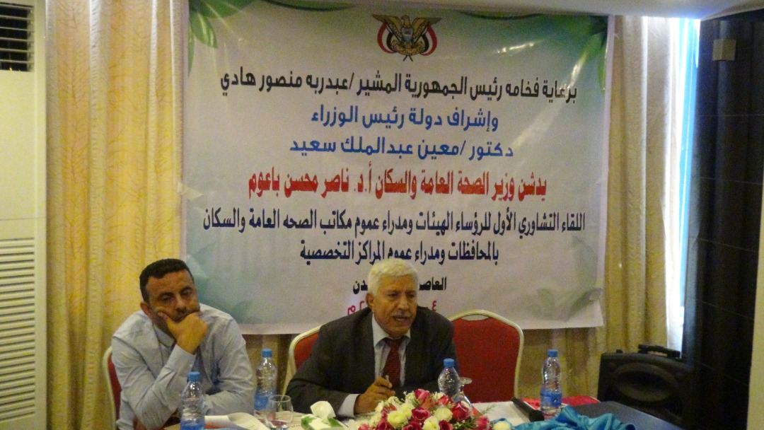وزير الصحة والسكان الدكتور ناصر محسن باعوم استغرض المراحل التي مرت بها وزارة الصحه العامه والسكان وكيف تم تجاوز المعوقات حتى تم الوصول الى منظومه متكامله للوزاره ببنيتها الاداريه والهيكليه والعمل المؤسسي وايجاد مقر ثابت للوزاره كما حث المشاركين علی ضرورة الخروج بتوصيات معقولة وقابلة للتنفيذ علی ارض الواقع...داعيا الجميع الی العمل علی انشاء قاعدة بيانات سليمه ودقيقه تشمل البنية التحتية والموارد البشرية والتجهيزات الثابته والمنقوله لتسهم هذه البيانات في تحديد الاولويات وفقا اتباع المنهجية العلميه والتخطيط السليم المعينه لصانع القرار ..مستعرضا عمل الوزارة والوحده التنفيذية خلال الاعوام المنصرمة .وتفعيل دور الوحده التنفيذيه للمشاريع المموله خارجيا .مطالبا باعداد الخطط والبرامج والدراسات للمشاريع المتعثره او المتاثره من الحرب لتتمكن الوزارة من حسن تسويقها للجهات المانحة واعادة تاهيلها