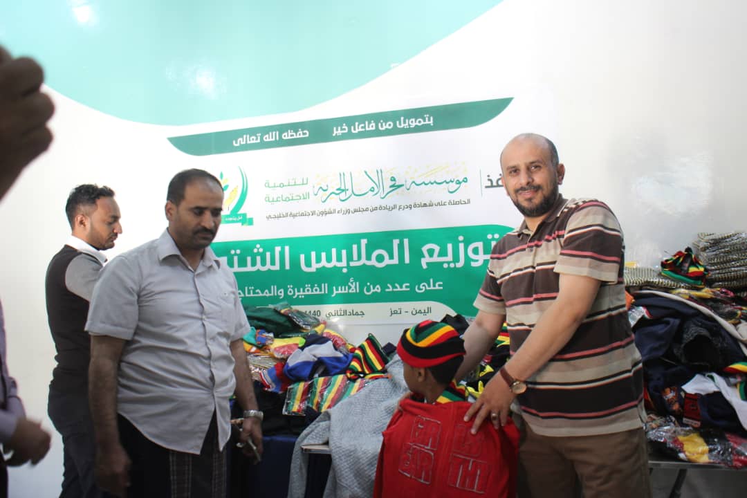بتمويل كريم من فاعل خير افتتحت مؤسسة فجر الأمل الخيرية للتنمية الاجتماعية مشروع توزيع الملابس الشتوية عدد 3200 قطعة بحضور الأستاذ مقبل القشائي منسق مؤسسة صنائع المعروف المكلا حضرموت في المحافظات الشمالية