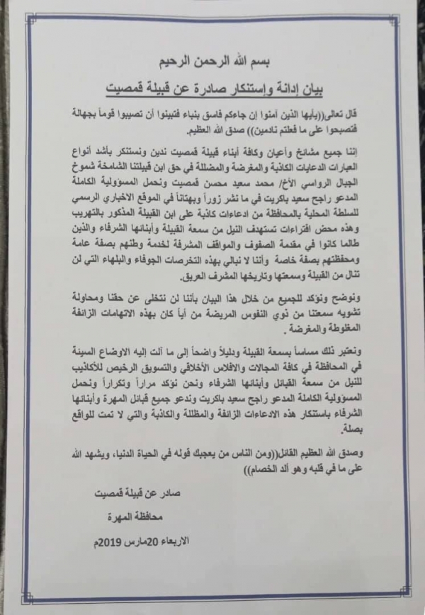 وقالت القبيلة في بيان لها حصل المهرة بوست على نسخة منه، إن أبناء وأعيان وكافة أبناء قبيلة قمصيت تدين ونستنكر بأشد أنواع العبارات الدعايات الكاذبة والمغرضة والمضللة في حق ابن القبيلة محمد سعيد محسن قمصيت.