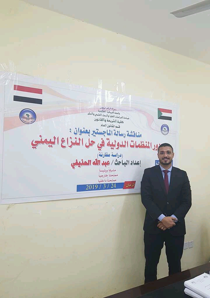جامعة إفريقيا تمنح الماجستيرللباحث عبدالله عبده الحذيفي القانون الدولي والعلاقات الدولية