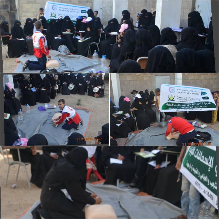بدعم ورعاية من مستشفى الاخلاص التعاوني الطبي بالنشمة دشن مكتب مؤسسة فجر الامل الخيرية للتنمية الاجتماعية - فرع الحجرية تنفيذ دورة في الاسعافات الاولية لمندوبات قرى عزلة السواء بالمعافر