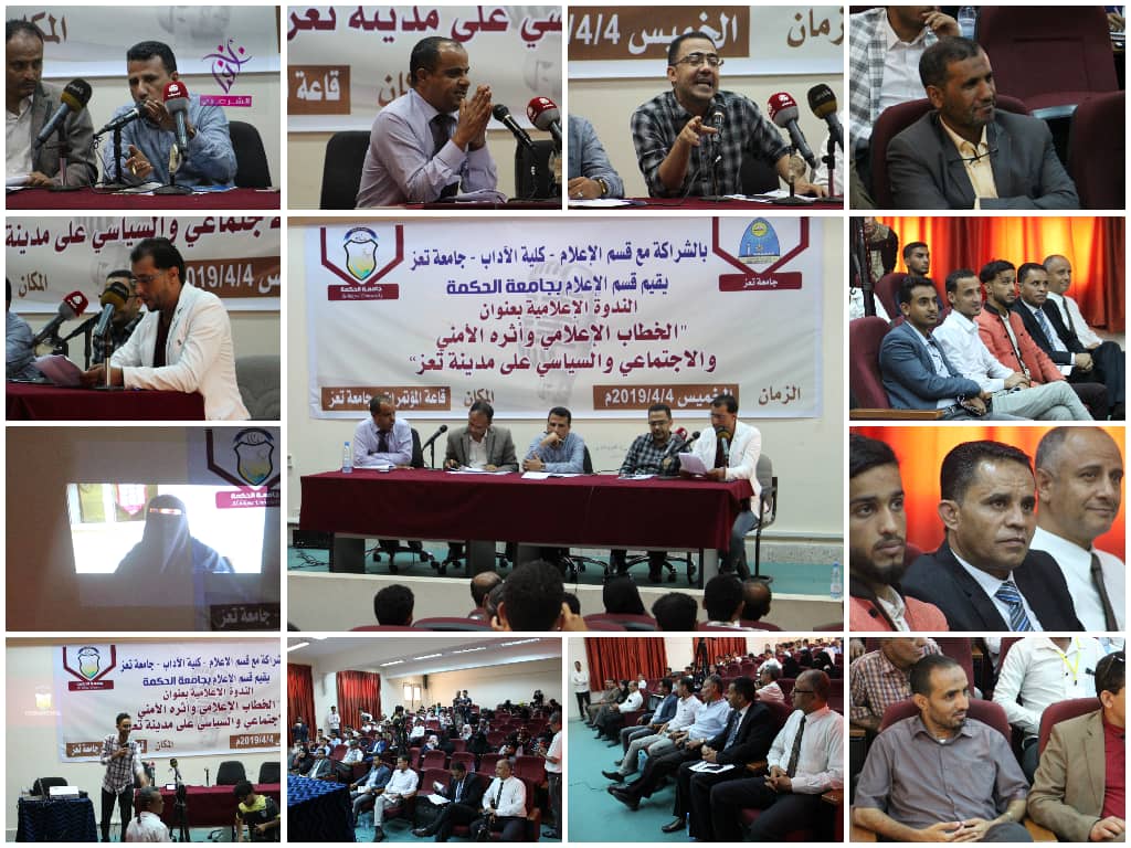قال عدد من السياسيين في محافظة تعز ان الخطاب الاعلامي كان له أثر كبير في الاحداث التى شهدتها مدينة تعز من صرعات وازمات مختلفة سواء علي الجانب الامني او السياسي. وأكدوا في ندوة نظمها قسم الاعلام بجامعة الحكمة بالشراكة مع قسم الإعلام في جامعة تعز بعنوان " الخطاب الإعلامي وأثره الأمني و الإجتماعي والسياسي على مدينة تعز "على أهمية توحيد الخطاب الاعلامي بما يخدم المدينة التي عانت الكثير منذ إنقلاب المليشيات الانقلابية على السلطة . وقال الدكتور عبده الكليبي رئيس جامعة الحكمة بتعز أن إقامة الندوة إستشعارا منا للدور الذي يجب ان تلعبه المؤسسات التنويريه والنخب الاكاديميه والاعلامية في وقت تحتاح محافظة تعز الى رؤى واقعيه تعمل على تصحيح مسار الدور الاعلامي بما يخدم التوجه العام لابناء المدينة . ودعا الدكتور الكليبي جميع الاعلاميين من كافة الاطراف الى توحيد الاعلام واظهار مدينة تعز بالوجه الذى ينظر اليها أبناء اليمن بالثقافة والعلم والاعلام. وكانت مدينة تعز قد شهدت معارك عنيفة بين الجيش وعناصر خارجة عن القانون رافقت تلك المعارك حملات إعلامية مظلله للراي العام عما حدث في المدينة وما قامت به السلطة المحلية واللجنة الامنية من تنفيذ قرارات اللجنة الامنية العليا بالمحافظة وكان المتحدثون في الندوة أ. فؤاد الحميري نائب وزيرالاعلام الاسبق و د. منصور القدسي دكتور في قسم الاعلام جامعة تعز والاعلامي في قناة يمن شباب عبدالعزيز الذبحاني. و نجيب قحطان وحضور عدد من الاكاديميين والمثقفين والسياسيين بمحافظة تعز
