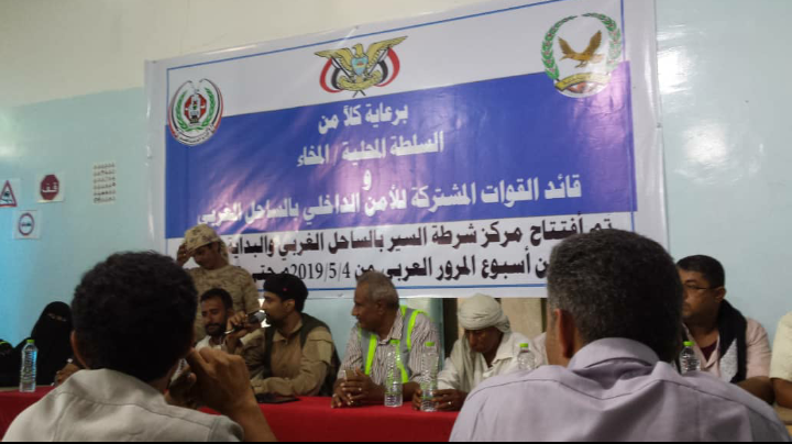 في اليوم الأول من أسبوع المرور العربي وبرعاية كلاً من السلطة المحلية في مديرية المخا وقائد القوات المشتركة للأمن الداخلي بالساحل الغربي تم إفتتاح مركز شرطة السير في الساحل الغربي . وافتتح العقيد زيد الطفّي قائد القوات المشتركة للأمن الداخلي بالساحل الغربي مركز شرطة السير في مديرية المخا بحضور قيادات في السلطة المحلية وبعض القيادات الأمنية في المخا ومنتسبي شرطة المرور في المدينة . وقال العقيد الطفّي أن عدد من مديريات الساحل الغربي ستشهد افتتاح مراكز شرطة السير لبدء عملها وتفعيل دورها الهام بالتخفيف من الإختناق المروري والإزدحام الذي تشهده عدد من مديريات الساحل الغربي . وأضاف العقيد الطفّي أن المؤسسة الأمنية تبذل أقصى الجهود لإستتباب الأمن والحفاظ على السكينة العامة للمواطنين في مختلف مناطق الساحل الغربي ، وشدد على ضرورة بذل مزيداً من الجهود والتعاون لتثبيت الأمن والإستقرار في كافة المناطق . وحث الطفّي منتسبي شرطة السير على تقديم صورة إيجابية ومشرّفة للمواطنين يعكس أهمية المؤسسة التي يعملون فيها ولما فيه مصلحة العامة .