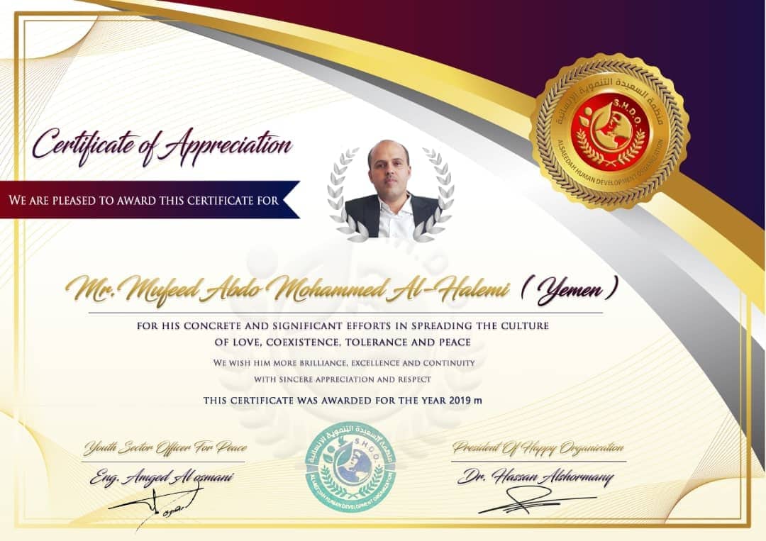 - منحت منظمــة السعيــدة التنمويــة الإنسانيــة شهادة تكريم عليا إلى السيد / مفيــد عبــده محمد الحالمــي رئيس لجنة السلام والمساجين وحل المظالم بمحافظة إب - رئيس الرابطة الوطنية للحب والسلام في الجمهورية اليمنية.