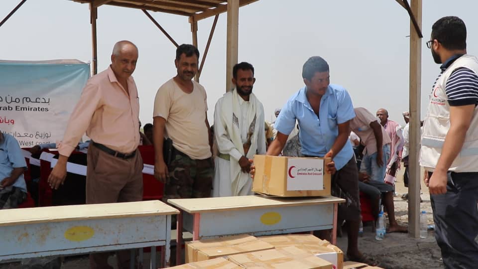 بدعم من دولة الإمارات العربية المتحدة، وزع الهلال الأحمر الإماراتي، اليوم كميات جديدة من أدوات ومستلزمات الصيد لـ 300 صياداً في مدينة المخا بالساحل الغربي لليمن.