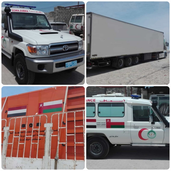 سلمت سلطنة عمان، ممثلة بهيئتها الإغاثية، اليوم الأحد، محافظة المهرة، شرقي البلاد، شحنة مساعدات من المستلزمات والأجهزة الطبية.