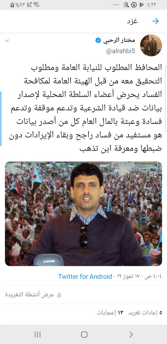 واستغرب الرحبي من تصرفات المحافظ المطلوب للنيابة العامة ومطلوب التحقيق معه من قبل الهيئة العامة لمكافحة الفساد يحرض أعضاء السلطة المحلية لإصدار بيانات ضد قيادة الشرعية وتدعم موقفة وتدعم فساده وعبثة بالمال العام موكداً إن كل من أصدر بيانات هو مستفيد من فساد راجح وبقاء الإيرادات دون ضبطها ومعرفة اين تذهب.