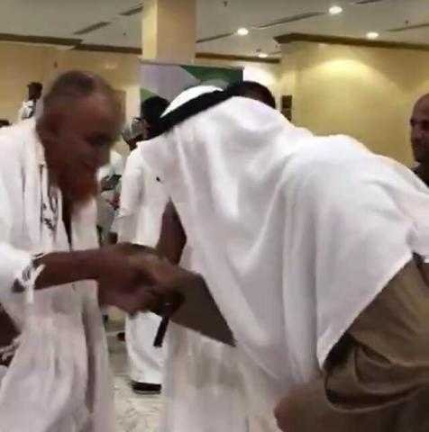 أقدم مطوف سعودي، بمكة المكرمة، على استقبال حاج يمني بحفاوة عالية، وقام بالسلام عليه وتقبيل يده.