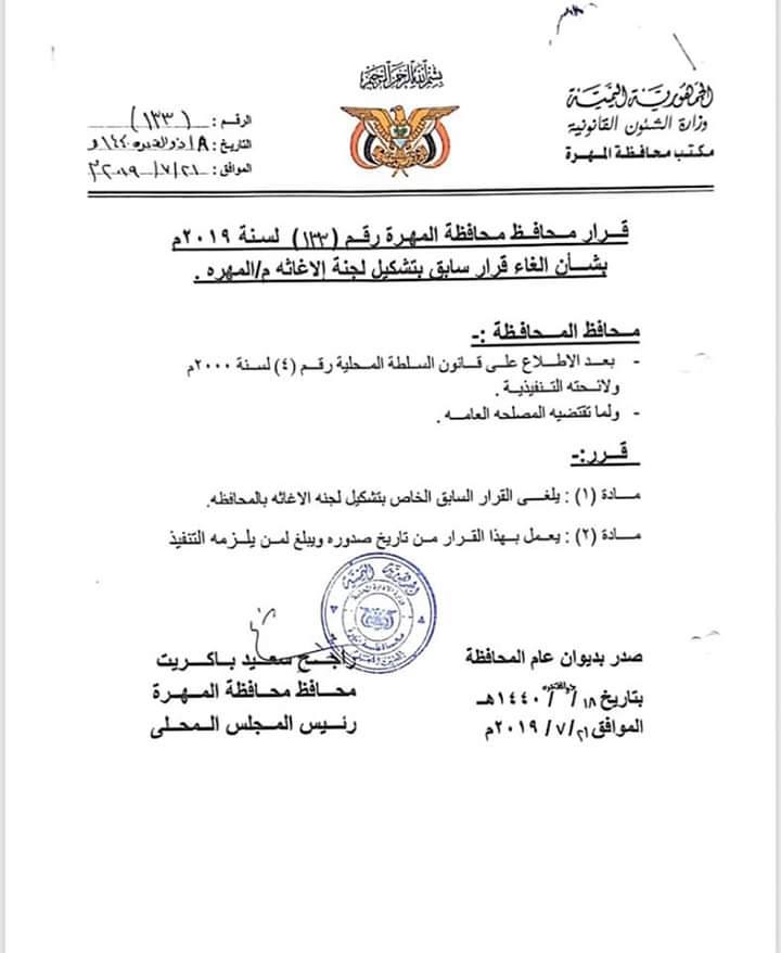قالت مصادر خاصة بالمهرة أن المحافظ باكريت أصدر قرارات ليست من صلاحياته وهي من اختصاص وزارة الادارة المحلية والحكومة وقام بالغاء اللجنة الامنية ولجنة الاغاثة، بالمحافظة.