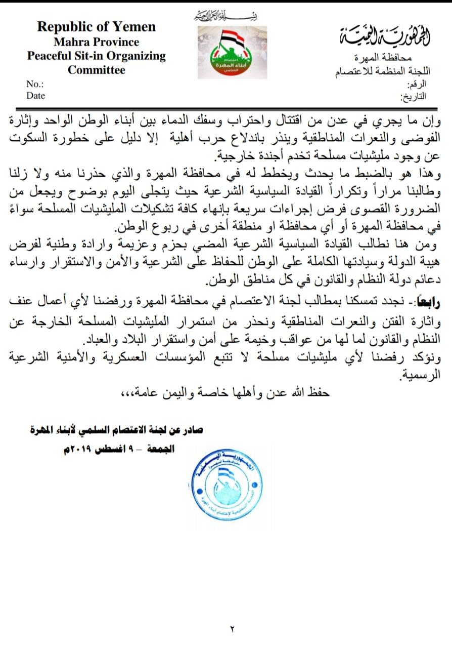 وجددت اللجنة المنظمة لاعتصام أبناء المهرة السلمي تأييدها ووقوفها خلف القيادة السياسية الشرعية للوطن ممثلة بفخامة الرئيس عبد ربه منصور هادي ومؤازرته بالقضاء على الفتنة ووقف الشرذمة الباغية عند حدها.