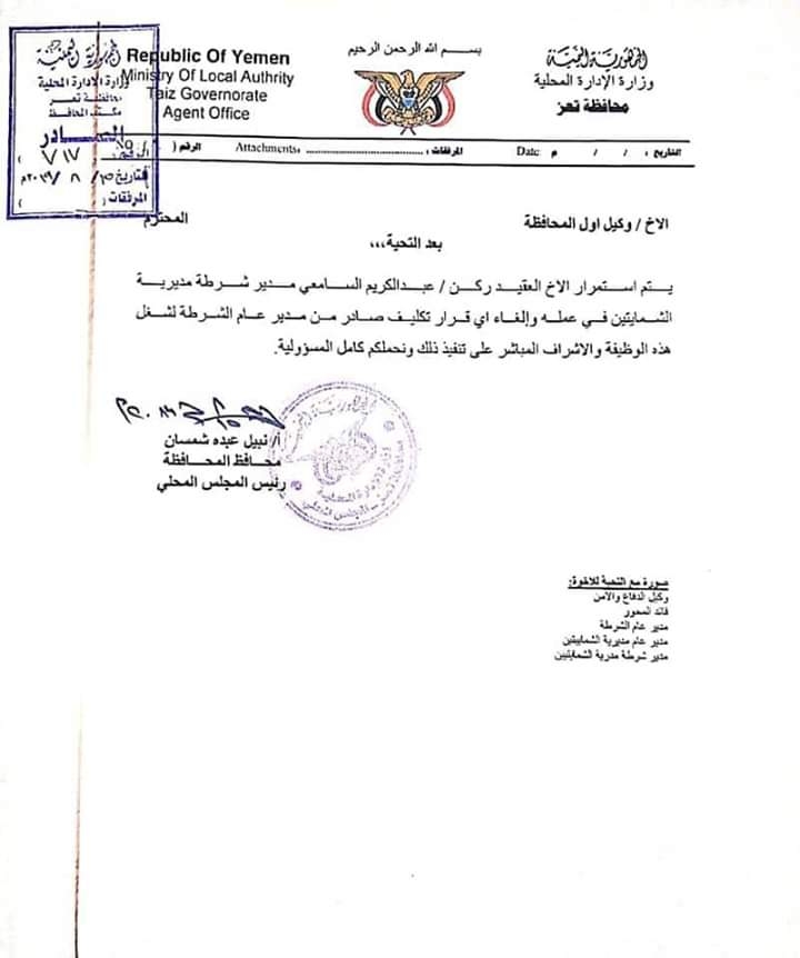 وأصدر محافظ تعز من محل إقامته في القاهرة تعليمات إلى مدير أمن تعز طلب منه إلغاء قرار تغيير مدير أمن التربة العميد الركن عبدالكريم السامعي وسحب القوات التي تسببت بفوضى أمنية في مدينة التربة وارعبت المواطنين هناك. لكن مدير الأمن تمرد على تلك التوجيهات واستمرت قواته بقطع شوارع التربة ومهاجمة مواقع تابعة للواء ٣٥مدرع.