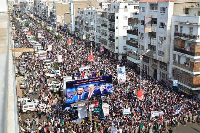 وقال اللواء بن بريك : "نقول لدول التحالف العربي ان هذه الجموع في المعلا تعانق جموع المكلا وسقطرى تتقدم اليكم بالشكر والامتنان لتلك التضحيات التي قدمتموها ورويتم بدمائكم التي امتزجت بدماء ابناء الجنوب تراب الوطن الطاهر " .