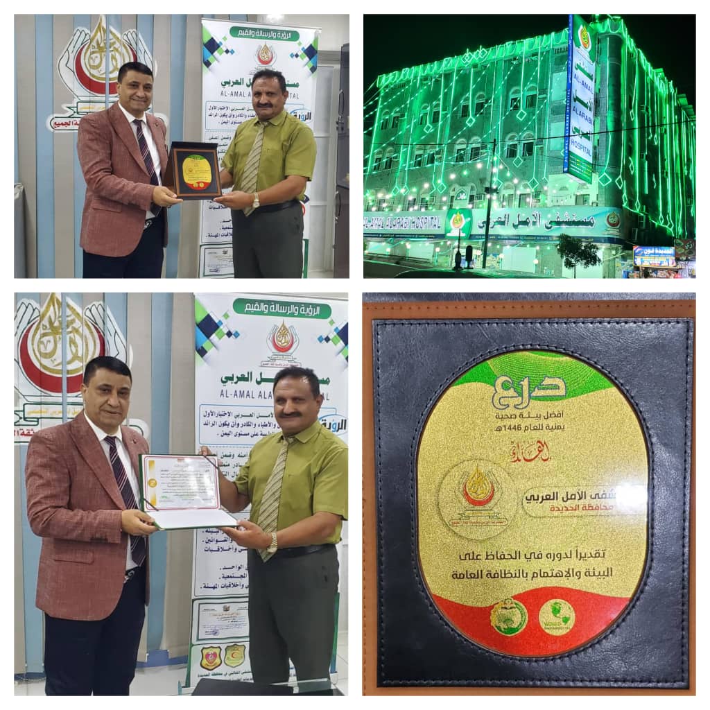 احتفلت إدارة مستشفى الأمل العربي بمدينة الحديدة اليوم بتتويج المستشفى بلقب افضل بيئة يمنية نظيفة للعام الثالث على التوالي والذي حصلت عليه في اليوم العالمي للبيئة الذي احتفلت به اليمن في الخامس من يونيو الماضي